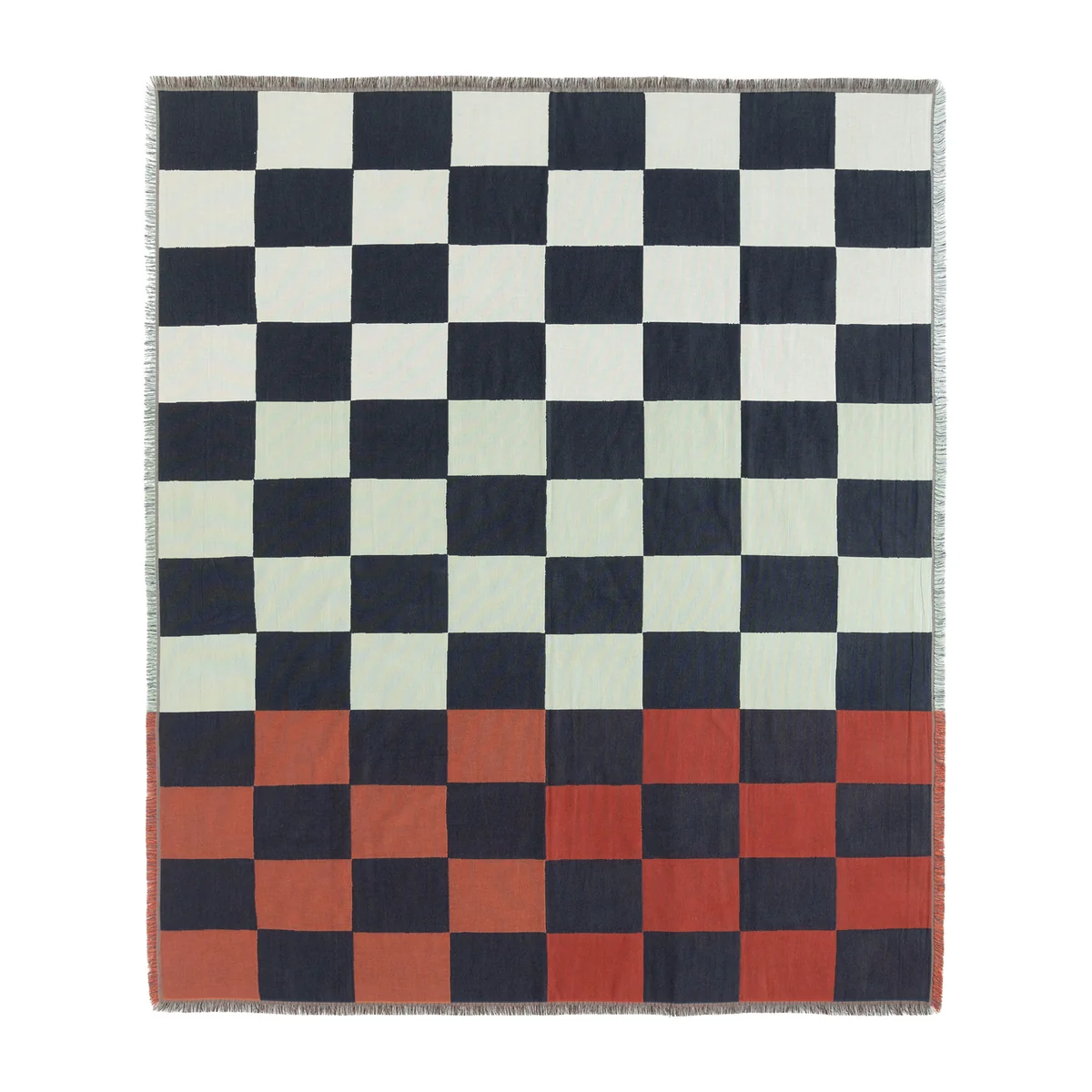 La couverture Kukko Ja Kana de Marimekko est fabriquée en coton bio selon la technique du tricot jacquard et comporte de courtes franges sur les côtés. Sur l'envers de la couverture, les couleurs du motif sont inversées.