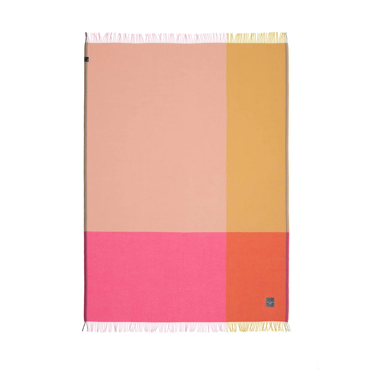 Avec les couvertures Colour Block, la designer néerlandaise Hella Jongerius montre les effets de la composition avec du fil de trame et du fil de chaîne lors du processus de tissage sur l'assemblage coloré. Quatre champs de couleurs contrastantes plus ou moins intenses forment le motif décoratif final. Le mélange respectif de deux couleurs de fils est visible sur les bords de la couverture : sur le côté court des couleurs avec des franges, sur le côté long avec des bords cousus.