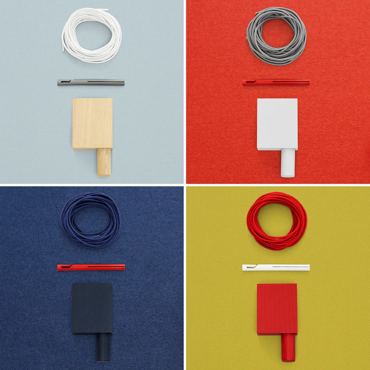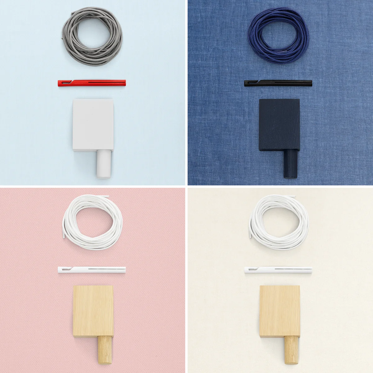 Le Ready Made Curtain de Ronan et Erwan Bouroullec pour Kvadrat est rapide et facile à assembler. Le mécanisme en bois et le support intermédiaire correspondant peuvent être assemblés rapidement et montés au mur ou au plafond. Le cordon se tire et se tend avec le support. Puis, les pinces Ready Made Curtain s'y ajoutent et portent le tissu du rideau.