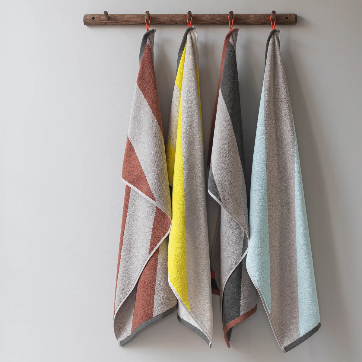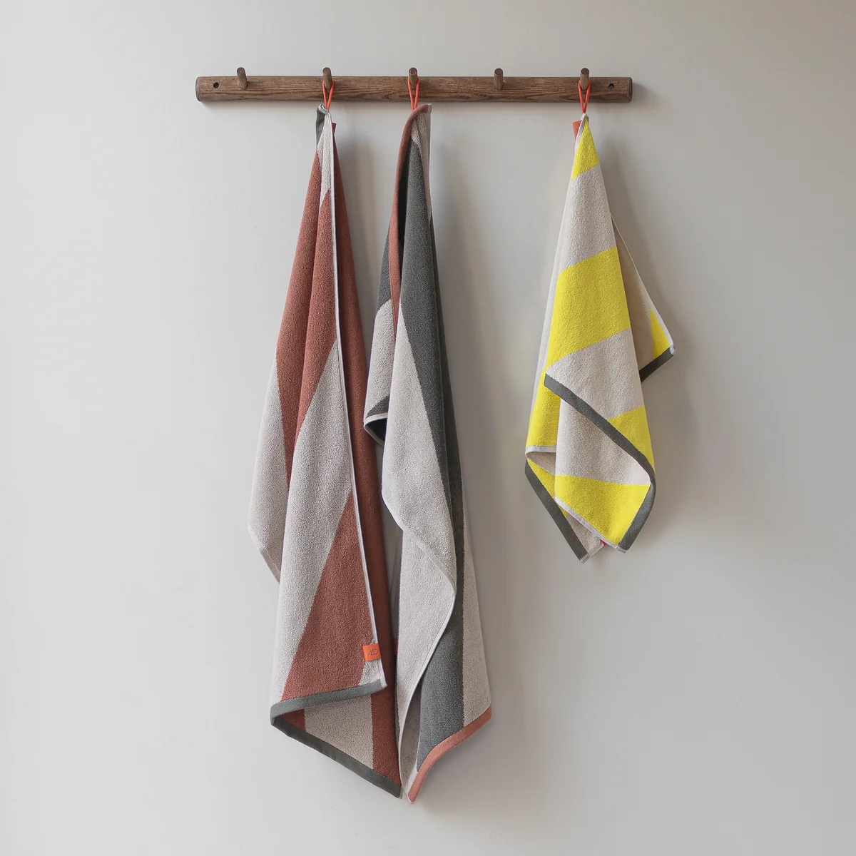 La serviette Diagonal de Mette Ditmer confère une touche de style à la salle de bain. Des rayures diagonales dans des tons chauds apportent chaleur et caractère, tandis que le bord crée un contraste élégant. La boucle orange sert à la fois de détail pratique et décoratif et complète le design moderne.
