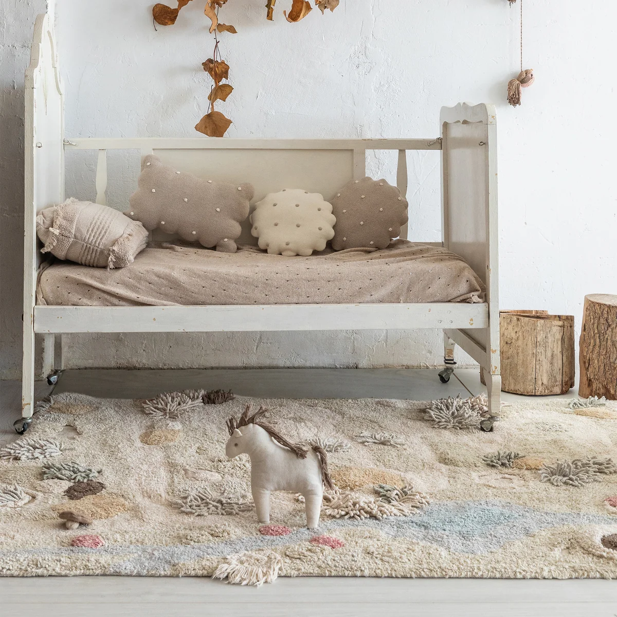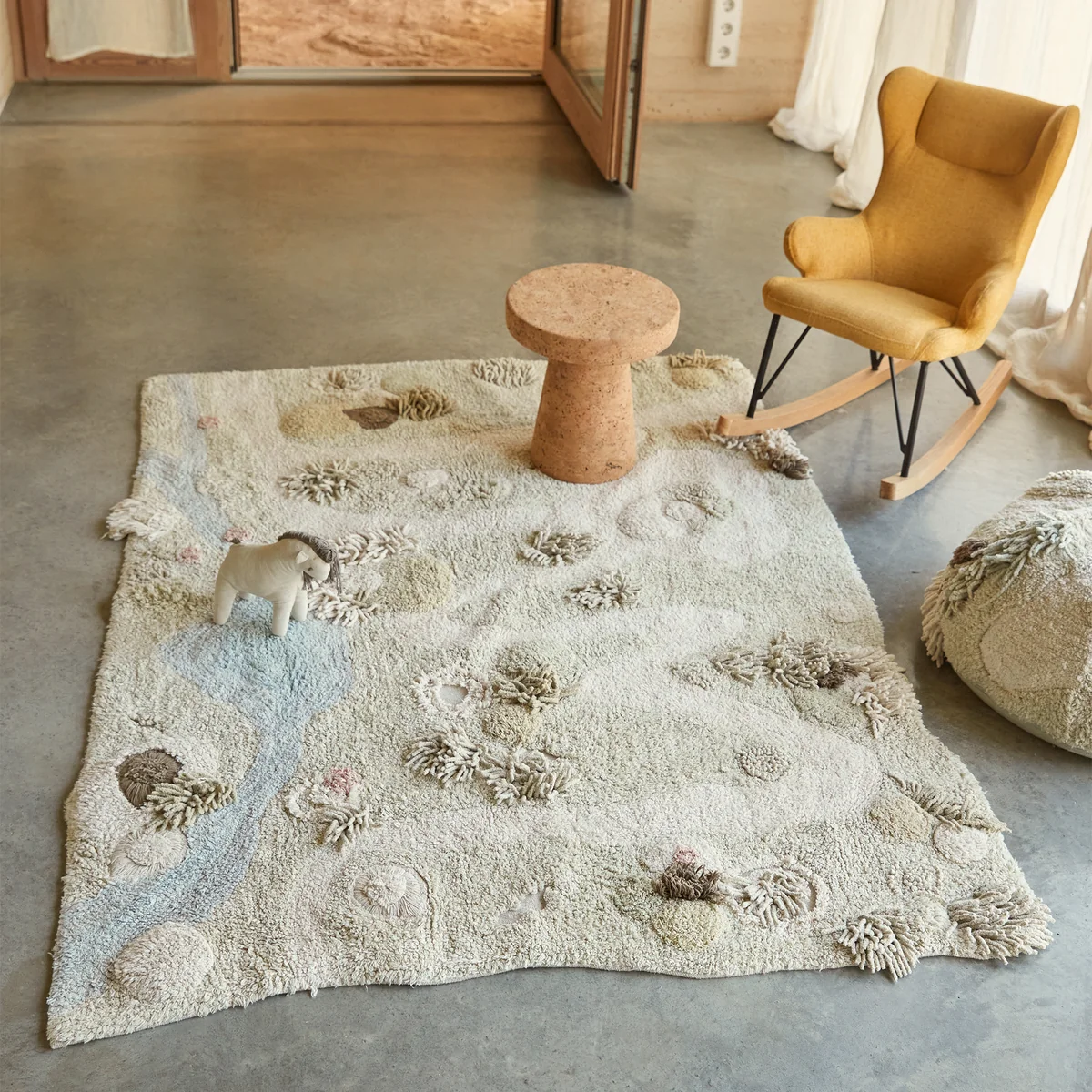 Le Path of Nature tapis de jeu de la maison Lorena Canals propose des processus d'apprentissage ludiques dans la forêt méditerranéenne. Les plus petits membres de la famille peuvent laisser libre cours à leur imagination et peuvent merveilleusement explorer les chemins et les structures de la forêt sur le petit cheval en peluche. Le tapis peut être merveilleusement placé et transporté dans toute la maison. Path of Nature est fabriqué à partir d'une base de coton avec des fibres textiles recyclées.